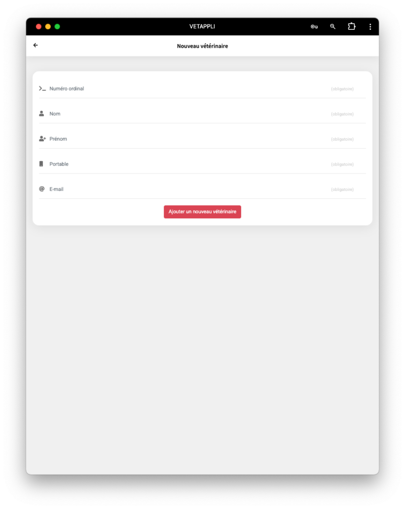 En cliquant sur l’icône + en haut à droite, vous pouvez ajouter un nouveau ou une nouvelle vétérinaire.