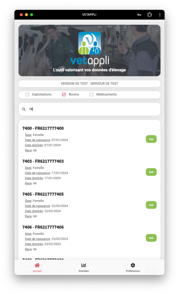 En page d’accueil quand une exploitation a été sélectionnée, vous pouvez rechercher un bovin en tapant son numéro de travail.