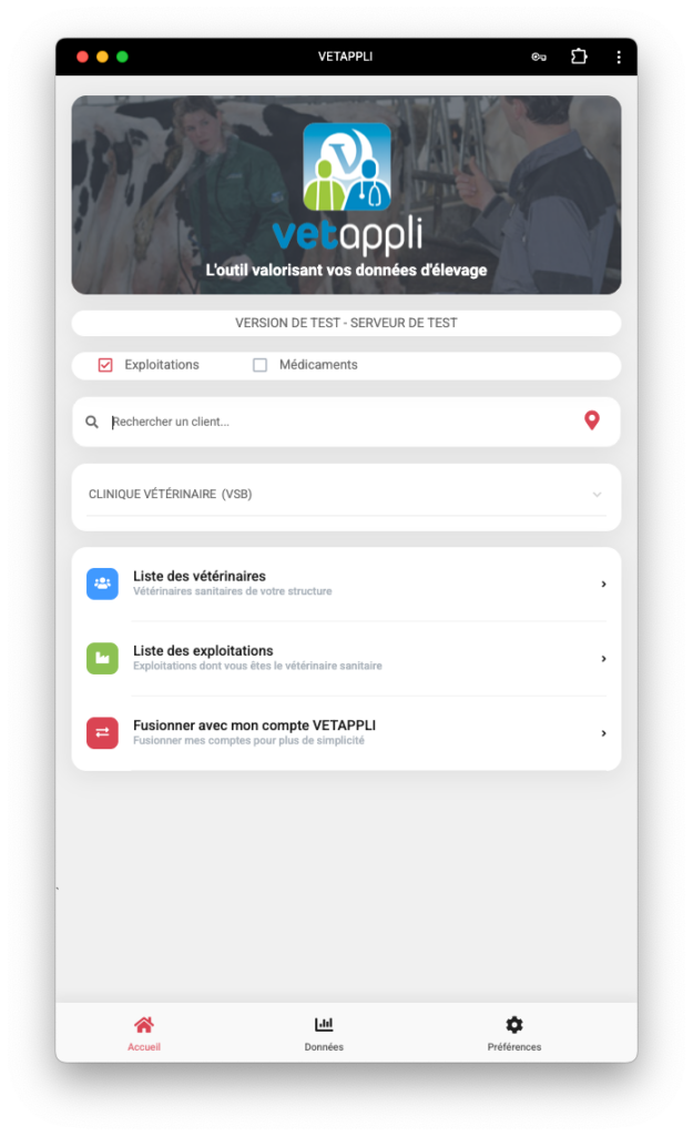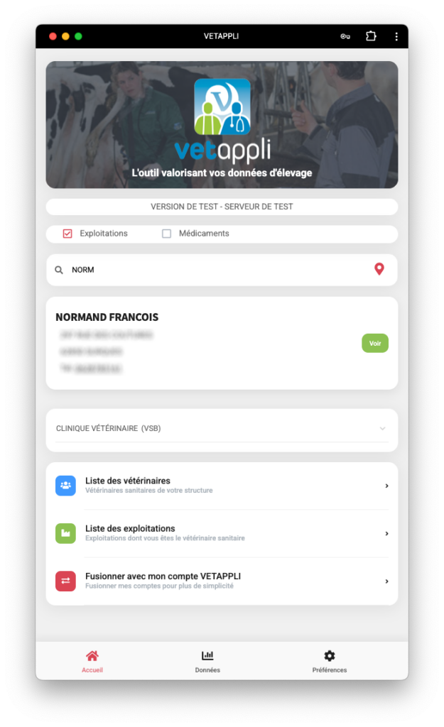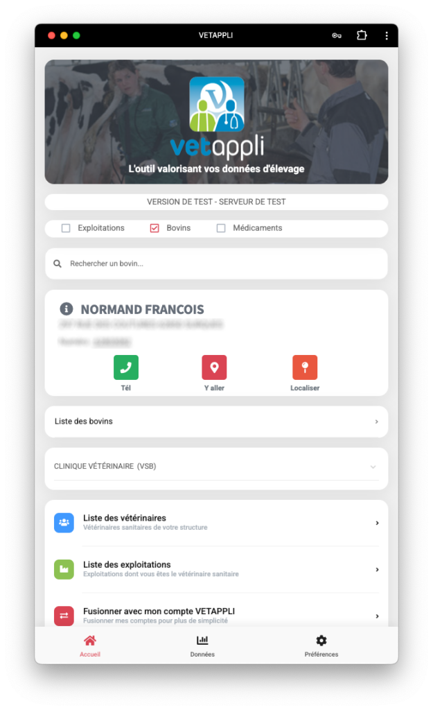 L’exploitation est sélectionnée et vous pouvez accéder à ses données.