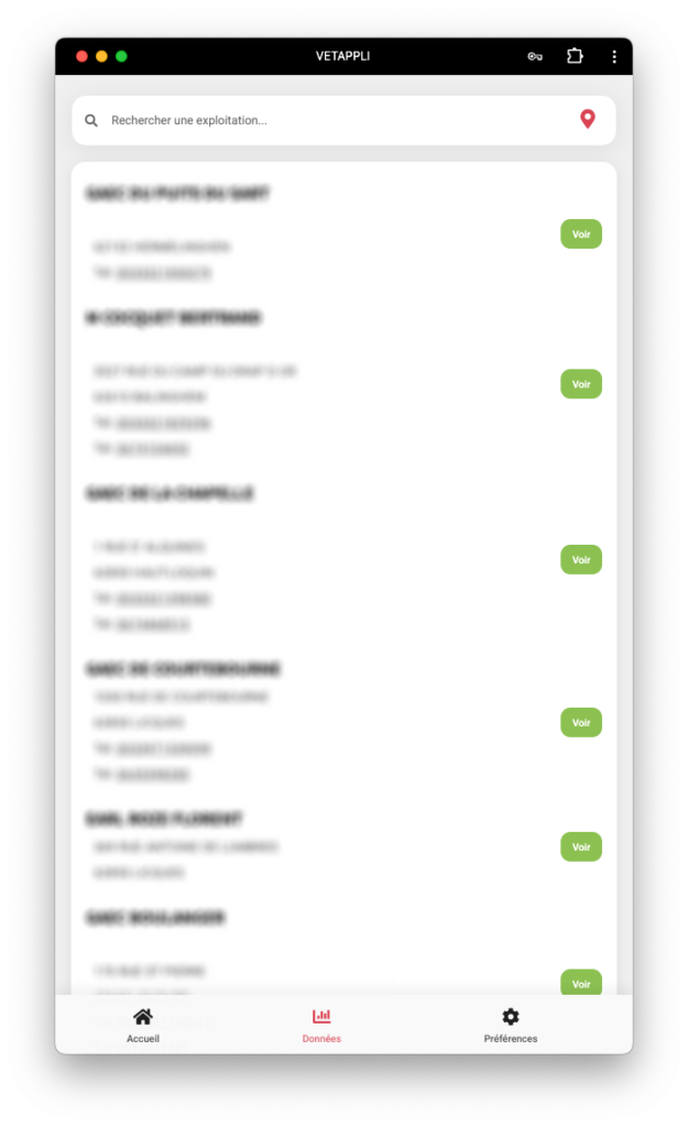 Si vous cliquez directement sur le bouton « Données » sans avoir sélectionné une exploitation, il vous sera demandé de la même façon de rechercher l’exploitation et de la sélectionner en cliquant sur « Voir » avant d’accéder à ses données.